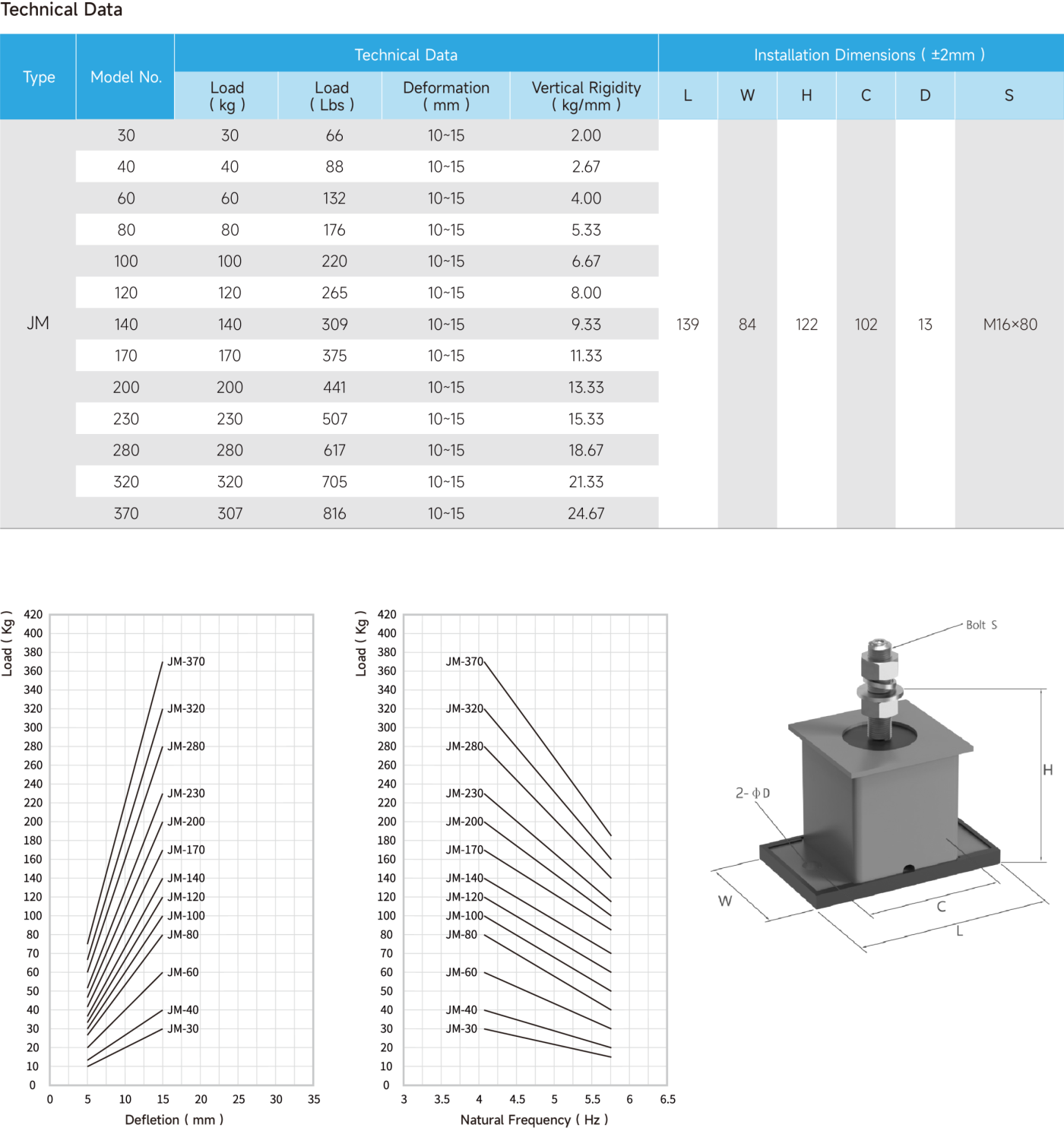 JM spring vibration mount consists of a housing, spring pressure cover,anti- skid rubber pad, vibration isolation spring and bolts. The spring