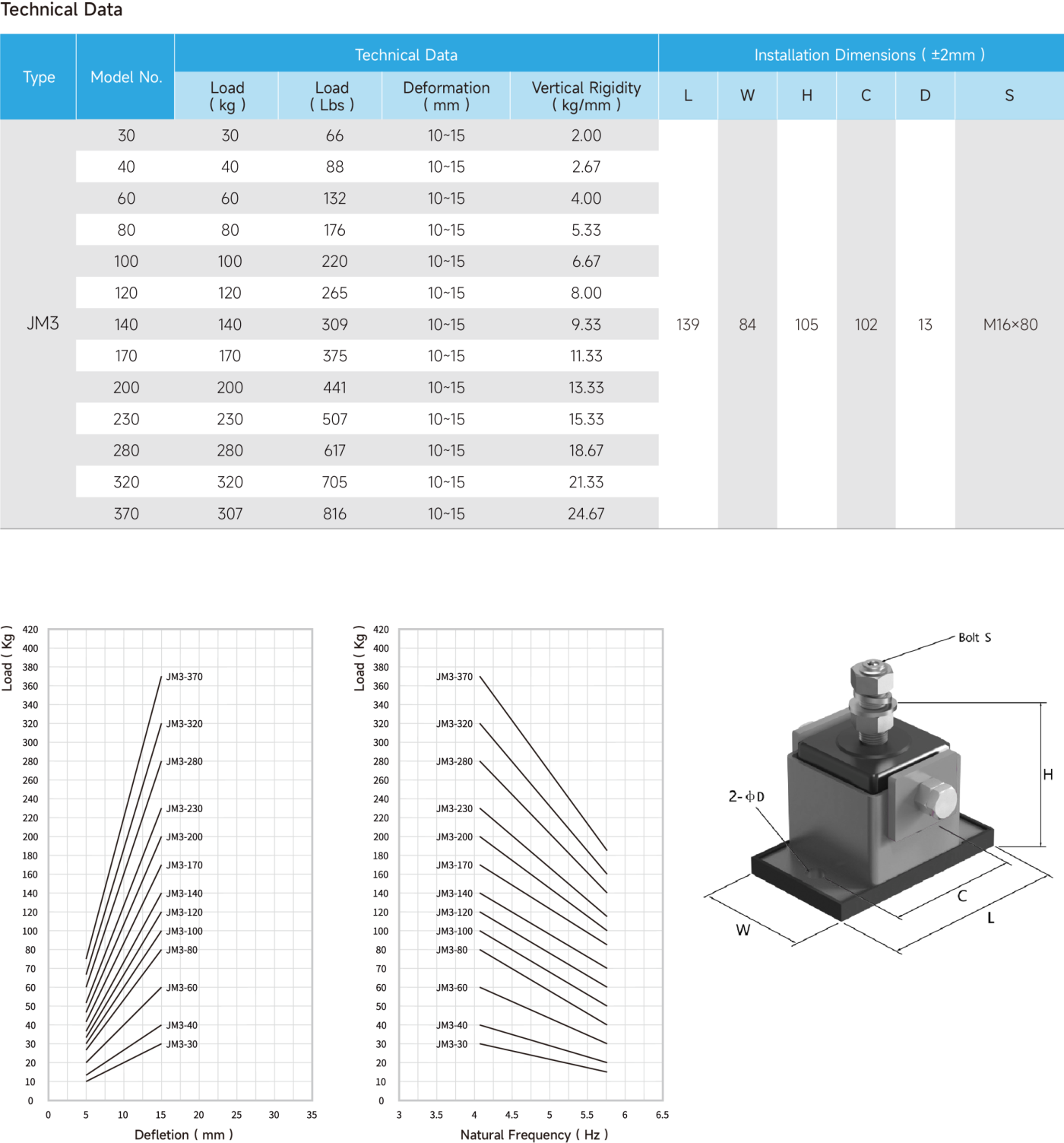 JM3 spring vibration mount is mainly composed of a rubber gland, a steel shell,an adjustable bolt and a vibration isolation spring. The gland is a combination of rubber and steel plate, which can effectively prevent noise caused by collision and friction.