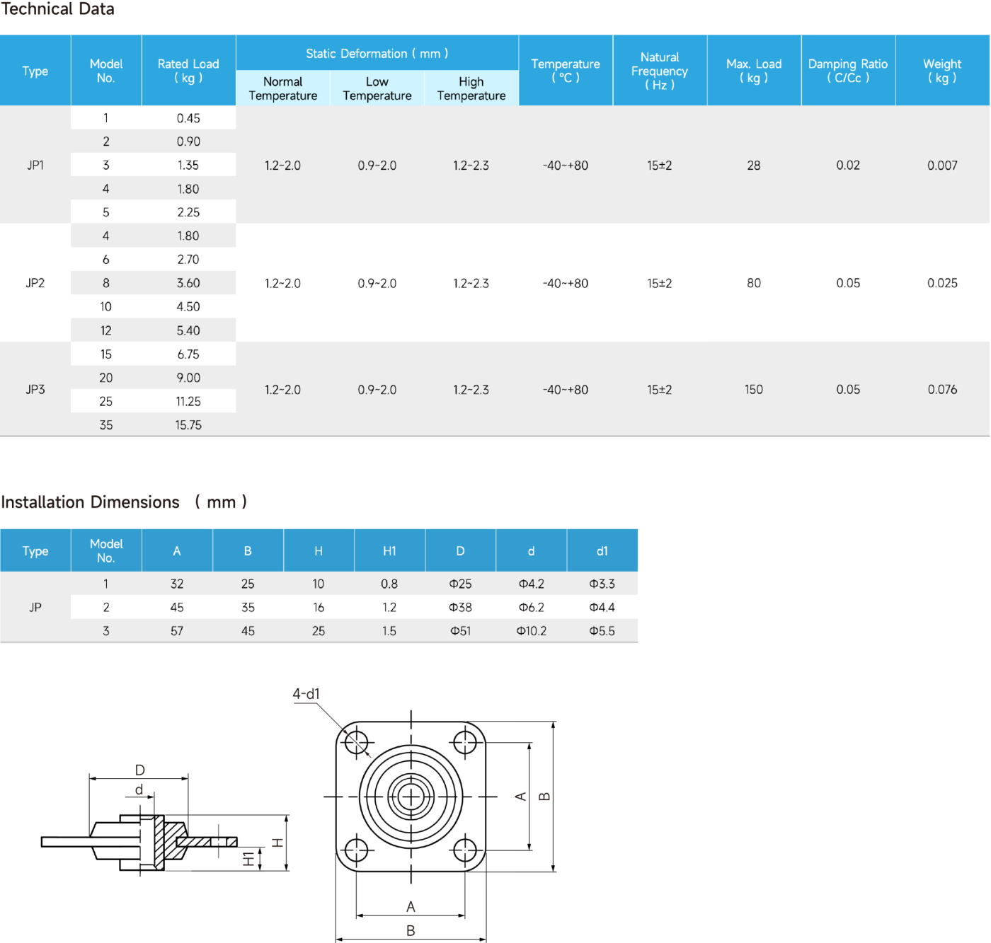 The JP series elastomer isolators are made of nitrile rubber, featuring oil resistance, aging resistance, and long service life. They are constructed with rubber sandwiched between inner and outer metal plates, produced by compression molding and available in multiple models. These isolators primarily rely on shear force, offering low natural frequency and a broad range of application frequencies.