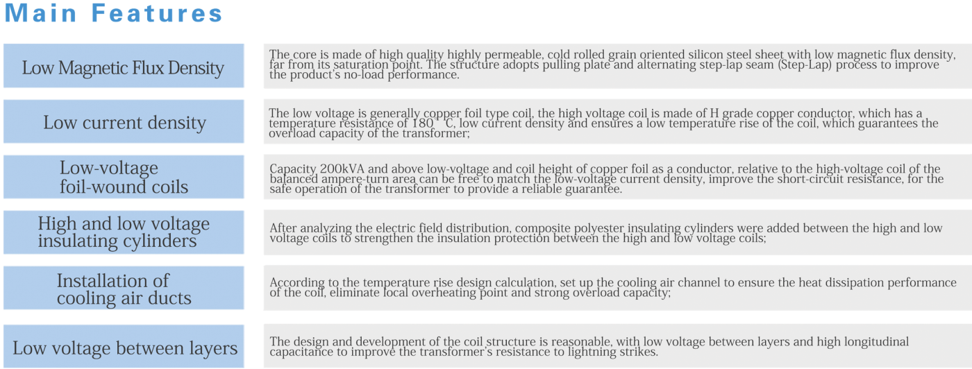 The new generation of energy-saving and environmentally friendly products features low loss, low partial discharge, low noise, and no pollution. While the length and width dimensions of the transformer remain basically unchanged, the height of the product is reduced to meet the special requirements of various occasions. The product has passed all the tests of the National Transformer Quality Supervision and Inspection Center and has been the first to obtain the “Green Choice” certificate from the Chinese Commodity Society.